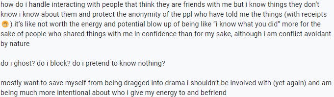 "mostly want to save myself from being dragged into drama i shouldn't be involved with (yet again) and am being much more intentional about who i give my energy to and befriend."