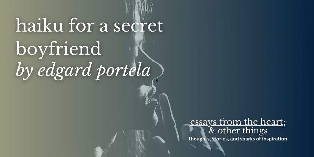i recently penned a haiku that encapsulates the delicate thrill of new love. titled "haiku for a secret boyfriend," it captures the tender moments of a burgeoning relationship, hidden yet vividly felt.