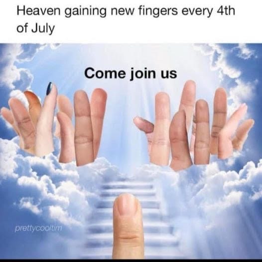 oh lord, this meme is just chef's kiss dark humor perfection. as someone who's survived more than a few questionable 4th of july celebrations myself, i can't help but cackle at the idea of heaven gaining a few extra digits every independence day. it's like the afterlife is trying to give us a thumbs up, but keeps getting more & more enthusiastic with each firework mishap. maybe this is why they say angels play harps and not guitars - too many spare parts floating around up there?